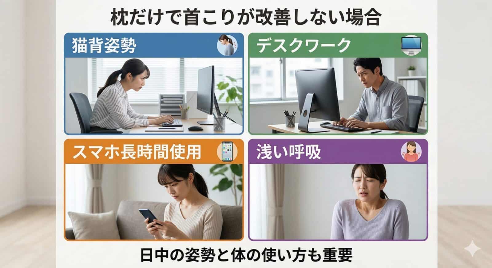枕が合っていても、次のような原因で首こりが起こることがあります。