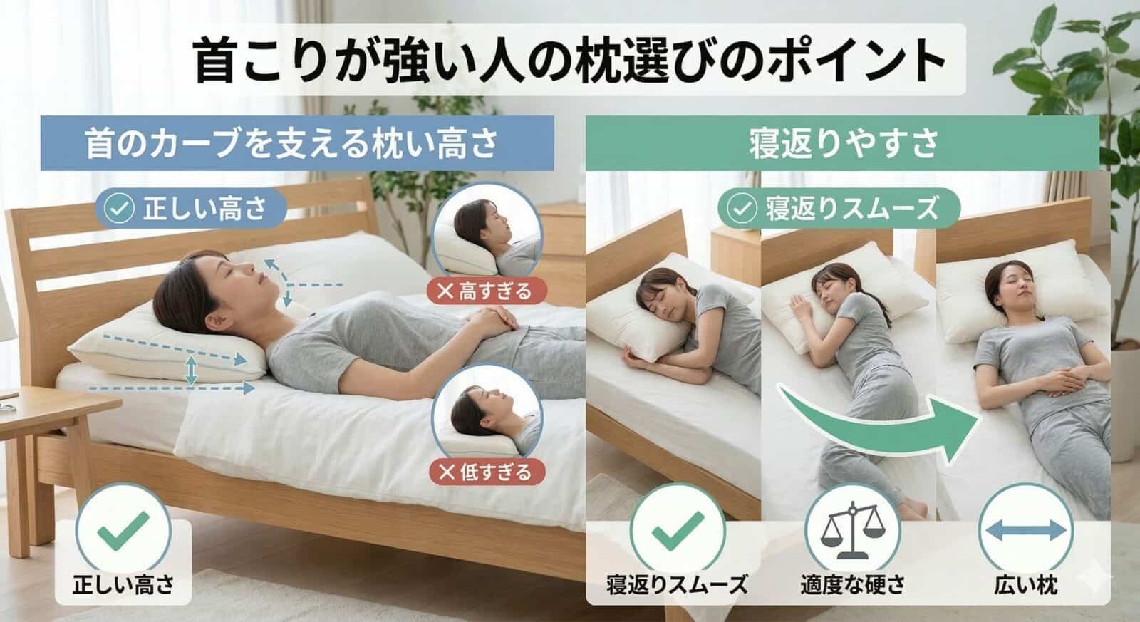 首こりが強い場合、枕の高さや形が合っていない可能性があります。
