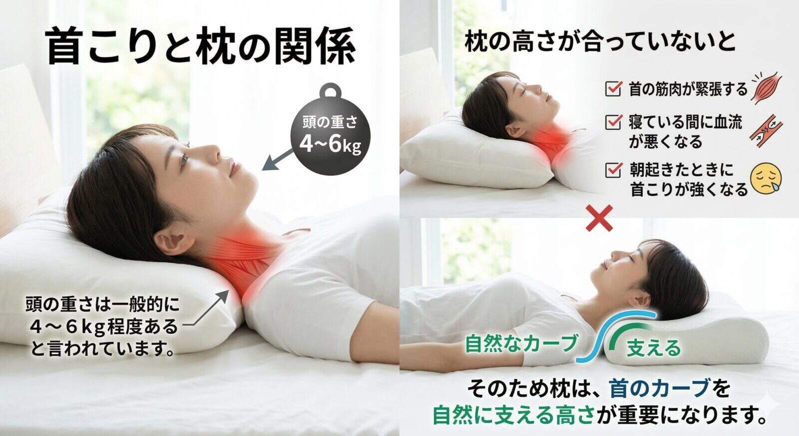 そのため枕は、首のカーブを自然に支える高さが重要になります。