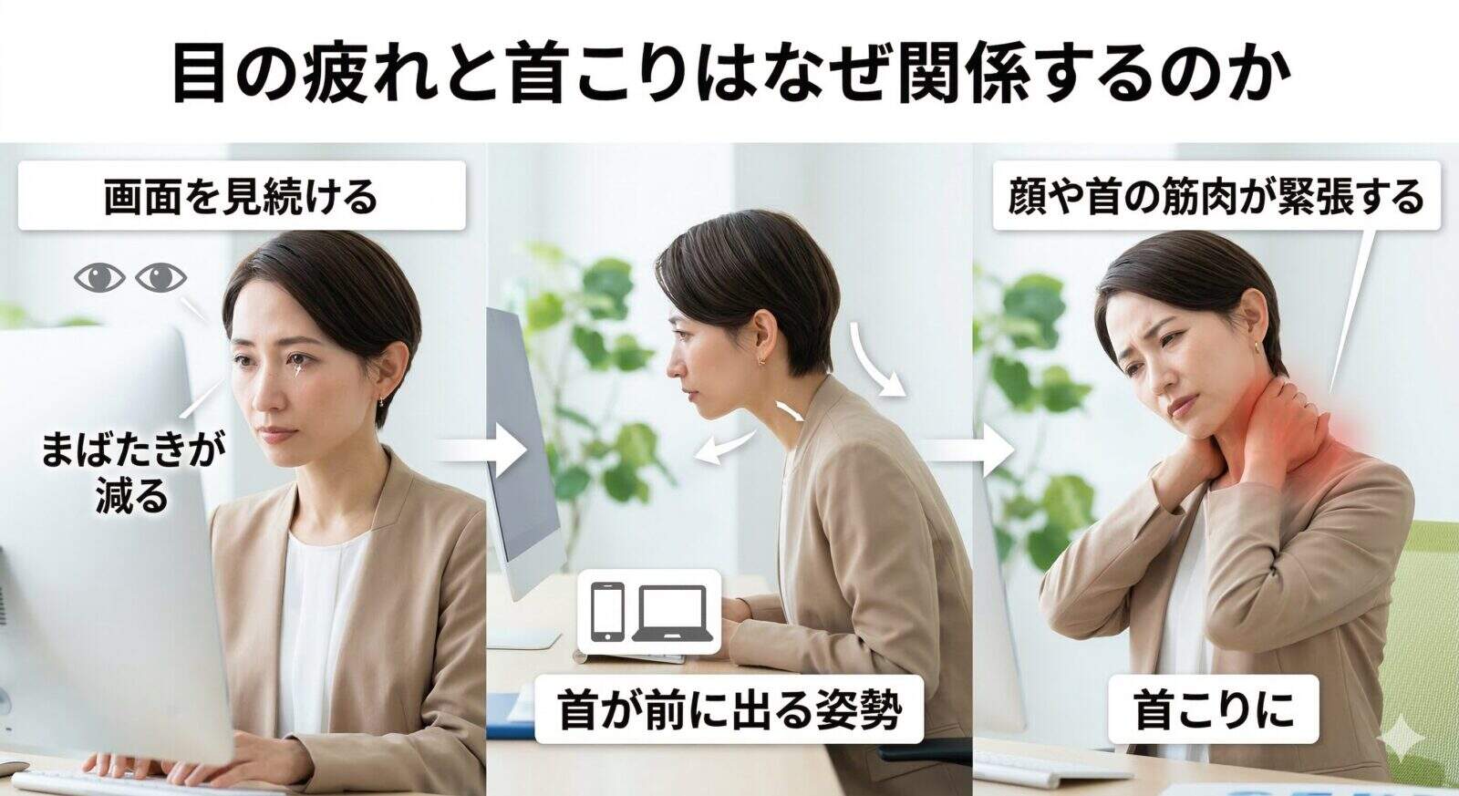 目の疲れと首こりは密接に関係しています。